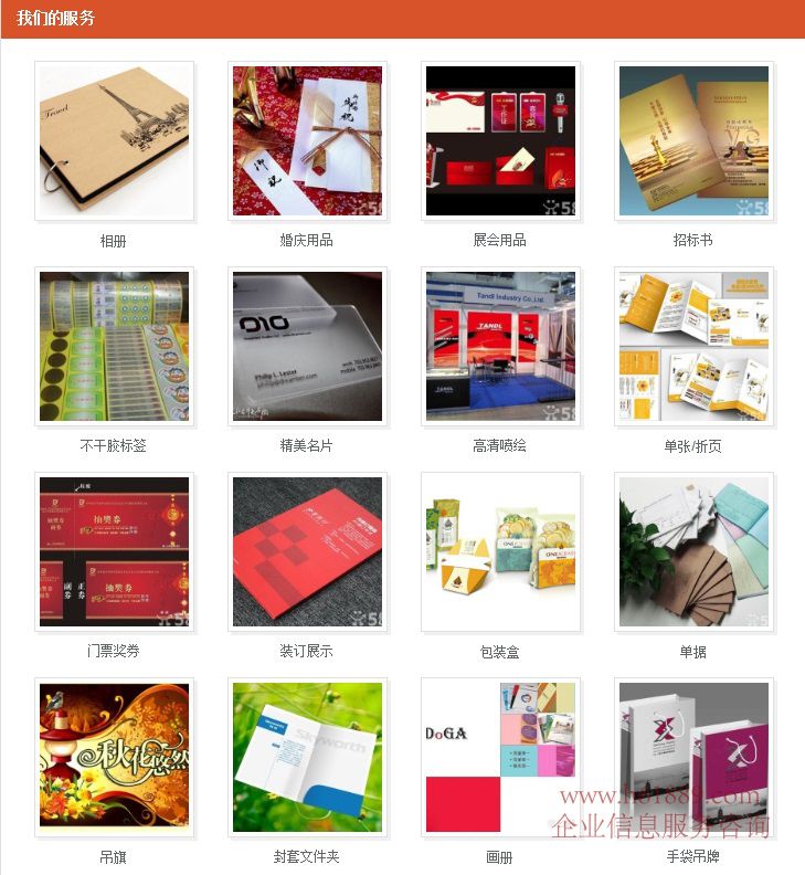 數(shù)碼印刷:畫冊書刊、高檔菜譜、相冊、招標書、精美名片、單張/折頁、獎券/門票、工牌/吊牌、婚慶用品、展會用品、不干膠標簽、高清噴繪、展架/易拉寶、裝訂展示。