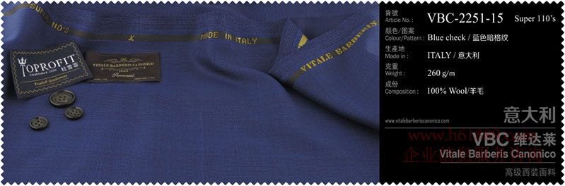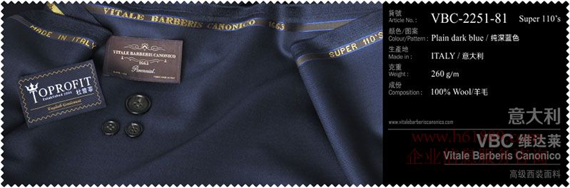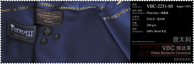 杜普菲:100%進(jìn)口面料、生產(chǎn)地:意大利、顏色圖案:純藍(lán)色、成份:100%羊毛、VBC維達(dá)菜:高級西裝面料