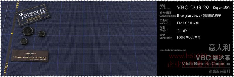 杜普菲:100%進(jìn)口面料、生產(chǎn)地:意大利、顏色圖案:藍(lán)色暗格紋、成份:100%羊毛、VBC維達(dá)菜:高級西裝面料