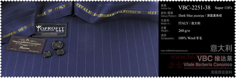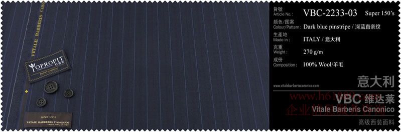 杜普菲:100%進(jìn)口面料、生產(chǎn)地:意大利、顏色圖案:深藍(lán)直條紋、成份:100%羊毛、VBC維達(dá)菜:高級西裝面料