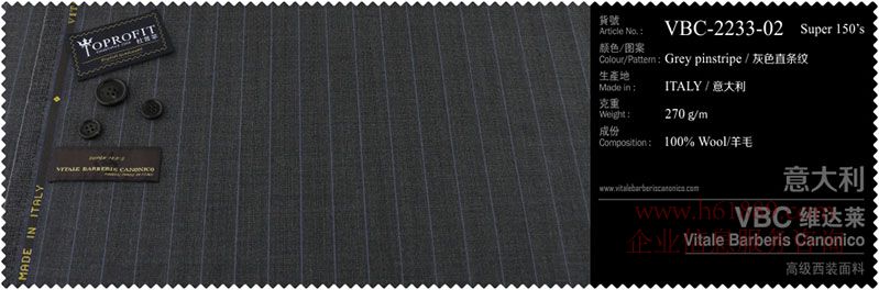 杜普菲:100%進(jìn)口面料、生產(chǎn)地:意大利、顏色圖案:灰色直條紋、成份:100%羊毛、VBC維達(dá)菜:高級西裝面料
