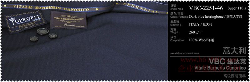 杜普菲:100%進(jìn)口面料、生產(chǎn)地:意大利、顏色圖案:深藍(lán)人字紋、成份:100%羊毛、VBC維達(dá)菜:高級西裝面料