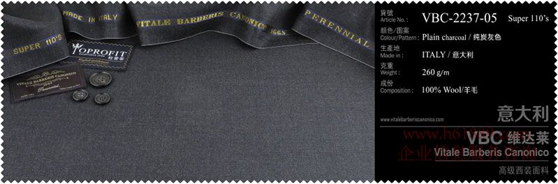 杜普菲:100%進(jìn)口面料、生產(chǎn)地:意大利、顏色圖案:純炭灰色、成份:100%羊毛、VBC維達(dá)菜:高級西裝面料