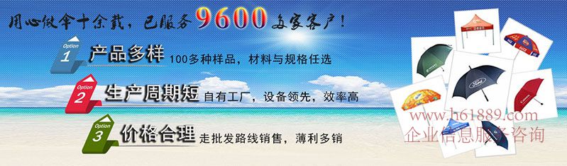 雨花石傘業(yè)有限公司是一家專注于雨傘、廣告?zhèn)?span style="font-family: 宋體,SimSun; font-size: 18px;">、戶外太陽傘、廣告帳篷、禮品傘、等產(chǎn)品設計、制作、銷售為一體的綜合性企業(yè)、憑借著質(zhì)量可靠、價格實惠、服務周到等優(yōu)勢在市場上擁有一批穩(wěn)定的客戶
