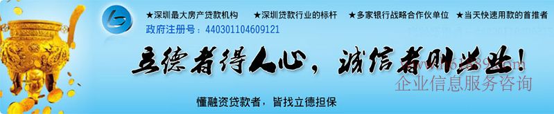 深圳市立德?lián)S邢薰荆菍I(yè)從事房地產金融服務的機構,注冊資本一億人民幣,政府注冊號:440301104609121,總部設立于深圳,在深圳寶安區(qū)、廣州市、上海市均設立有分公司,為行業(yè)內最大的個人消費房產貸款擔保服務品牌性公司。“立德?lián)!逼放疲罕粡V大客戶評為擔保服務與創(chuàng)業(yè)投資的一流品牌,擔保行業(yè)資本市場3A級征信企業(yè)單位:更譽為行業(yè)中的信用等級擔保機構AAA信用等級