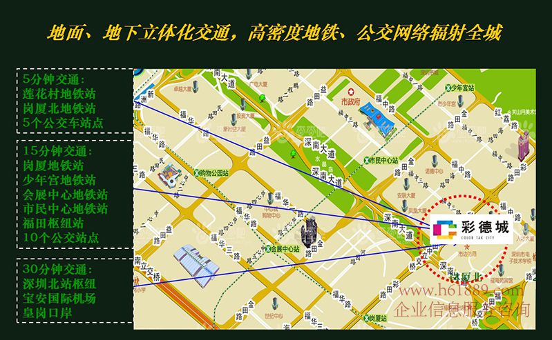 周邊三條主干道(深南大道、彩田路、紅荔路)輻射城市東西南北、交通便利、四通八達(dá)、深南大道、深圳城市主干道、全長(zhǎng)25.6公里、彩田路南北走向、南起彩田南立交橋、和福民路最東端相連、北行經(jīng)過福華路、福中路、紅荔路、蓮花路、筍崗西路