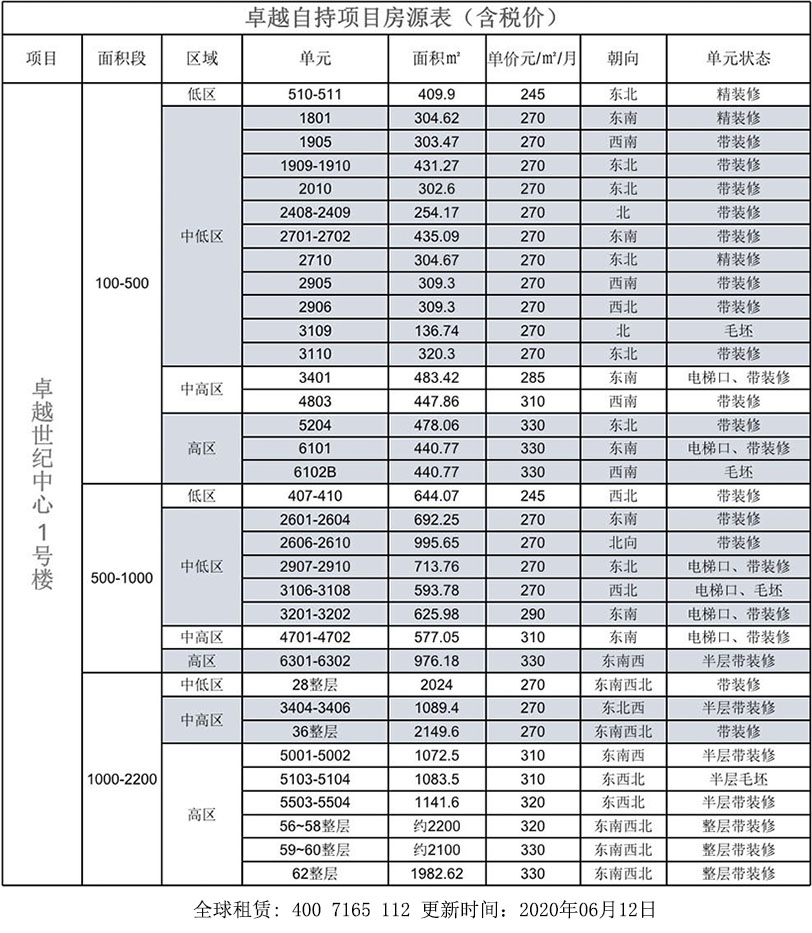 卓越世紀中心1號樓:樓層:12樓、出租面積:268平米、出租單價:168元/平米/月、出租總價:45024元/月