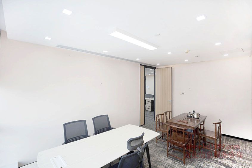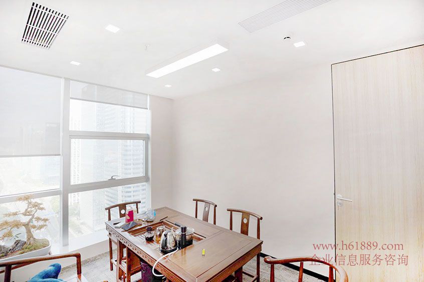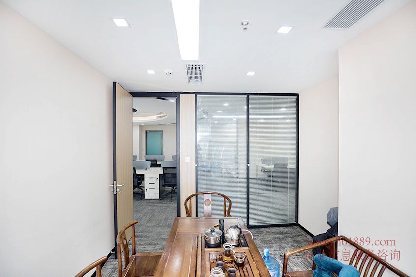3、物業(yè)位于大廈高層、大氣的雙開玻璃門、里面有5個(gè)隔間、1大廳、東北采光、戶型方正、全辦公家私、近電梯口