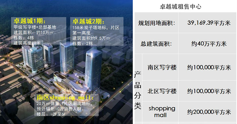 卓越城分為、南北兩區(qū)、北區(qū)包括4棟寫(xiě)字樓、1-3#樓、整層面積約為1450平、其中4#樓為總部基地、產(chǎn)品形式深圳首創(chuàng)、為4層獨(dú)立墅級(jí)辦公,總面積約為3200平米