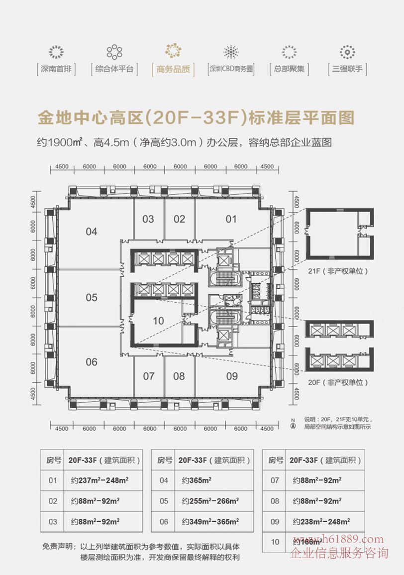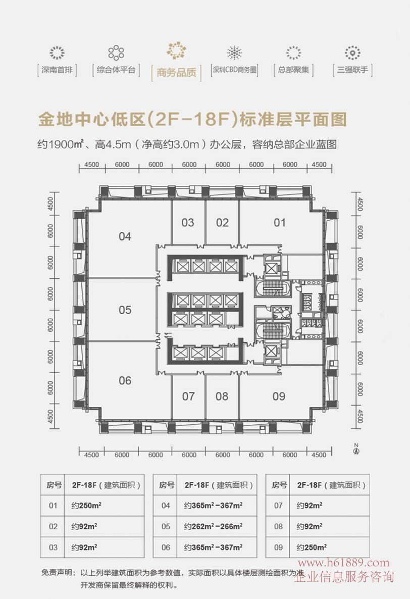 金地中心:建筑面積:6萬平方、33層、高效辦公18部進口日立電梯、300個停車位(共享綜合體商業(yè)3000多個停車位)、電梯配比和車位配比遠優(yōu)于其它寫字樓、國際知名設計公司SOM設計、福田CBD*的白色窗花立面、超高辨識度、方便企業(yè)商務往來、國內首創(chuàng)無柱設計的寫字樓、雙大學堂、首層陽光大堂1000平方、挑高13.5米、LEED金級