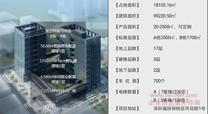 金融科技創(chuàng)新中心(原創(chuàng)凌通科技大廈)位于深圳市福田保稅區(qū)市花路1號、用地面積18105.16㎡、總建面積95220.50㎡、計容面積63368.00㎡、樓高17層、其中三層為商業(yè)裙樓、其中塔樓A棟約3.5萬平方米、B棟約3萬平方米、兩棟塔樓加裙樓約10萬平方米、地下車位700個、加地下停車場二層高約十米共約建筑面積13萬平方米、屬規(guī)劃計入容積率面積是63368平方米