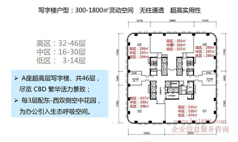 戶型面積:165平米、195平米、277平米、364平米、393平米、447平米、466平米、493平米、527平米、596平米、593平米、640平米、817平米、906平米、1769平米、1730平米、1833平米、面積任意組合(可以連層出租)