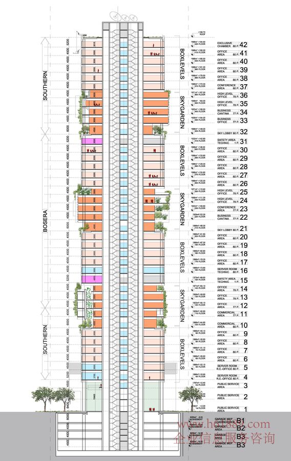 博時基金大廈(南方博時基金大廈)在裙樓之上、大廈塔樓的設(shè)計將垂直綠化融合、外表獨特、同時為新的工作方式和可持續(xù)提供了可行方案、從縱向看、大廈每5、6層便形成一個不同的分區(qū)、并如此向上重復(fù)3、4次、其中、“盒子”分區(qū)以每6層為單元、每層相同、而“空中花園”分區(qū)以每5層為單元、但這5層卻都不盡相同