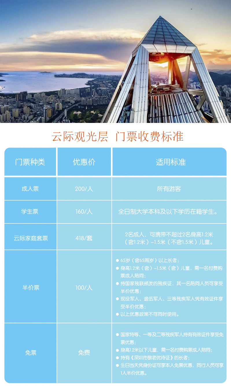 由中國平安集團(tuán)投資、歷時7年建設(shè)的平安金融中心、建 筑總高600米、超越廣州“小蠻腰”、目前位列世界第四、中國第二、華南和深圳第一的最新地標(biāo)式摩天樓、Free Sky 云際觀光層位于116層,集觀光旅游、科技人 文、藝術(shù)情感、社交空間于一體、可360°俯瞰八方風(fēng)貌、已成為深圳更具科技人文內(nèi)涵的首選潮流觀光地標(biāo)