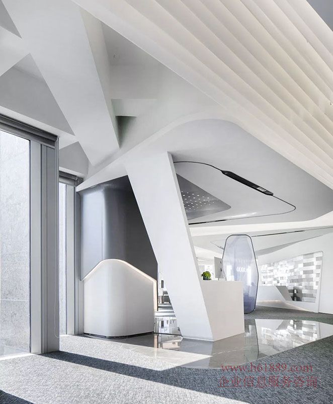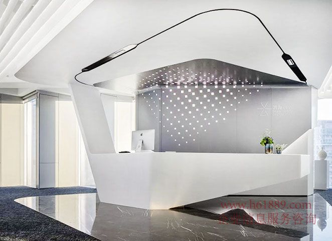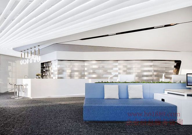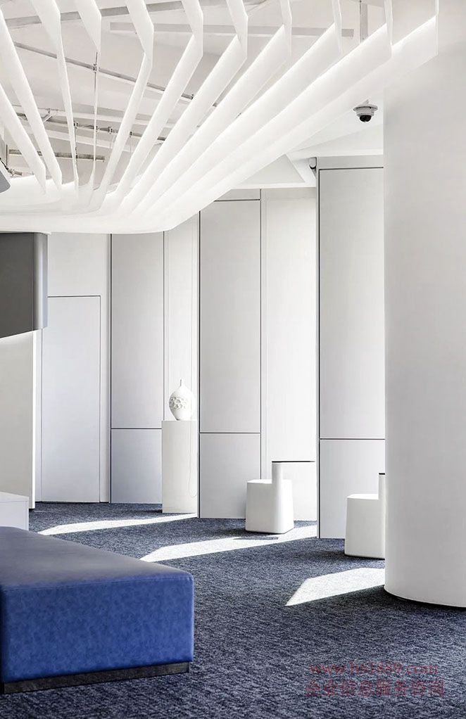 在設(shè)計(jì)語言表達(dá)方式上,設(shè)計(jì)師以簡潔的白色折線形態(tài)做為空間的主導(dǎo)元素,以游動(dòng)、穿透、回旋與韻律作為空間的主題,起伏的白色亞克力天花折面造型以其簡約的線條和充滿未來感的設(shè)計(jì)語言勾勒出兼富有節(jié)奏且兼具人文感和科技感的共享立體空間。而空間里深色石材與淺色地毯的序列排布,則以厚重感與輕盈白色天花頂?shù)目侦`相依存,輕盈且富有空間張力,進(jìn)一步打造出空間的層次與韻律。公區(qū)、玻璃窗邊可拼接組合椅及軟裝藝術(shù)品的陳列,每一處都變成設(shè)計(jì)的誘導(dǎo)者,引領(lǐng)來訪者的好奇心,直至抵達(dá)下一個(gè)空間情境。