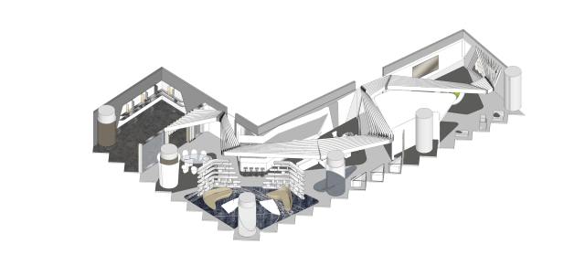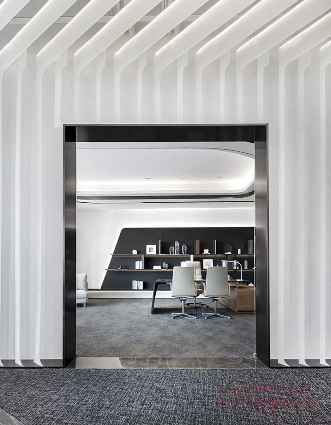 Undulation and curves are elementsrepeatedly used in the Binhai Cloud Center. Meandering through the interior,velocity of the curves creates rhythm and a cadence of space form. The color and materiality of the undulationsare carefully articulated; the use of white material adds to the futuristicatmosphere and boundlessness of common area. And juxtaposition of dark color stone/ grey carpet to the white aluminumceiling flow-lines creates a hierarchy in a mesmerizing space where oppositescoexist. In the public area, rows of chairs and artworks are located, each ofthem becoming a key space of the project that will spark curiosity of visitors.