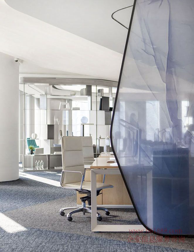 右側(cè)辦公功能展示區(qū)前端的Tiffany藍(lán)藝術(shù)玻璃屏風(fēng)則為空間做了一個(gè)視覺聚焦及引導(dǎo)著動(dòng)線行進(jìn)。
