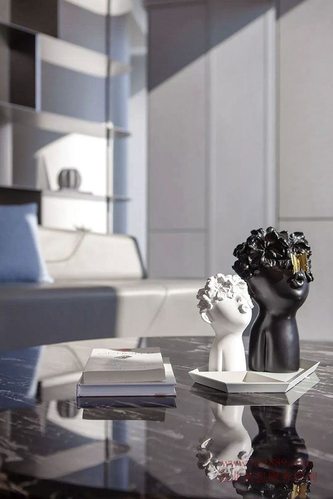在設(shè)計(jì)選材上,設(shè)計(jì)師則力求物盡其用,用統(tǒng)一而純粹的材料把“用”發(fā)揮到極致。當(dāng)極簡的白色亞克力天花在波瀾起伏的造型下,透過玻璃捕捉光的溫度;當(dāng)高級(jí)灰不再作為奢華的唯一表達(dá),而是嘗試以豐富肌理感來呈現(xiàn);當(dāng)以絹絲綢帶為意向鑲嵌的Tiffany藍(lán)藝術(shù)玻璃屏風(fēng)如靈動(dòng)的寶石游走于空間,平衡空間未來感中的一抹“溫暖”;當(dāng)幾何面料的沙發(fā),灰色的地毯和鏡面不銹鋼的茶幾,形成有趣又充滿現(xiàn)代酷感的軟式搭配組合的圍合。一切浮現(xiàn)的簡約未來、輕盈靈動(dòng)與溫潤質(zhì)感,正是這個(gè)空間打動(dòng)人心的所在。