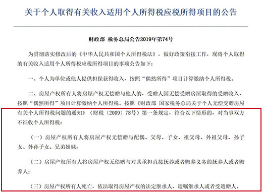 其中,對于房產(chǎn)的無償贈送,《公告》指出:受贈人因無償受贈房屋取得的受贈收入為“偶然所得”,繳納20%稅率。