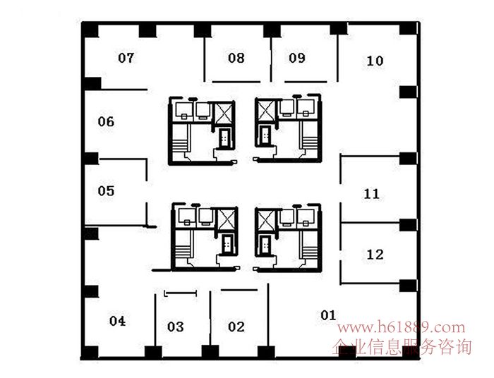 塔樓標(biāo)準(zhǔn)層面積為1726平方米、平面上呈正方形、每面為五個柱距、空間分布合理、在整個中心區(qū)的塔樓中、實用率最高、辦公區(qū)域離走道的距離最近、采光面也最大、立面上采用寬幅幕墻設(shè)計、十分顯赫尊貴、根據(jù)項目單層面僅1800平方米以下的特點、項目分割非常靈活