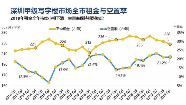 深圳甲級(jí)寫字樓市場(chǎng)全市租金與空置率 2019年租金全年持續(xù)小幅下滑 空置率保持相對(duì)穩(wěn)定