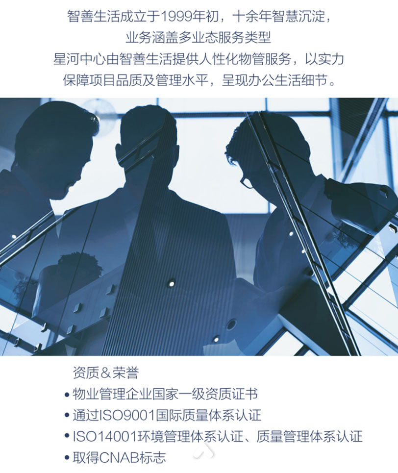 深圳星河智善生活股份有限公司(智善生活):智善生活成立于1999年初、十余年智慧沉淀、業(yè)務(wù)涵蓋多業(yè)態(tài)服務(wù)類型、?星河中心【星河發(fā)展中心】由智慧生活提供人性化物業(yè)服務(wù)、以實力保障項目品質(zhì)及管理水平、呈現(xiàn)辦公生活細節(jié)、資質(zhì)+榮譽、物業(yè)管理企業(yè)國家一級資質(zhì)證書、通過ISO9001國際質(zhì)量體系認證、ISO14001環(huán)境管理體系認證、質(zhì)量管理體系認證、取得CNAB標(biāo)志