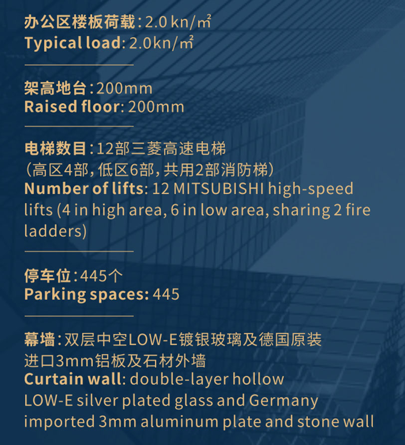 4:高效配置:12部:三菱高速電梯;停車位:445個、車位比:70:1;雙層中空LOW-E鍍銀玻璃及德國原裝進口:3mm 鋁板及石材外墻
