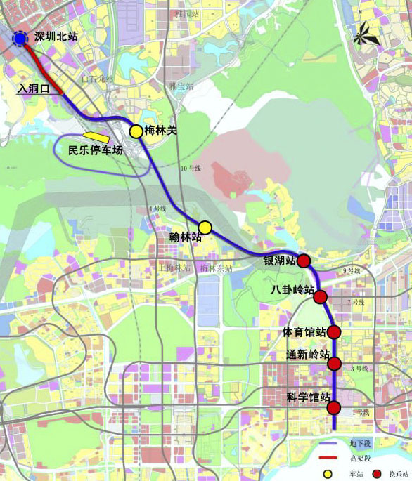 二期工程起自深圳北站,終于科學(xué)館站,經(jīng)過龍華、梅林、銀湖、八卦嶺、上步等片區(qū),線路全長約11.5公里。設(shè)車站7座,分別是深圳北站、梅林關(guān)站、翰林站、銀湖站、八卦嶺站、通新嶺站和科學(xué)館站。