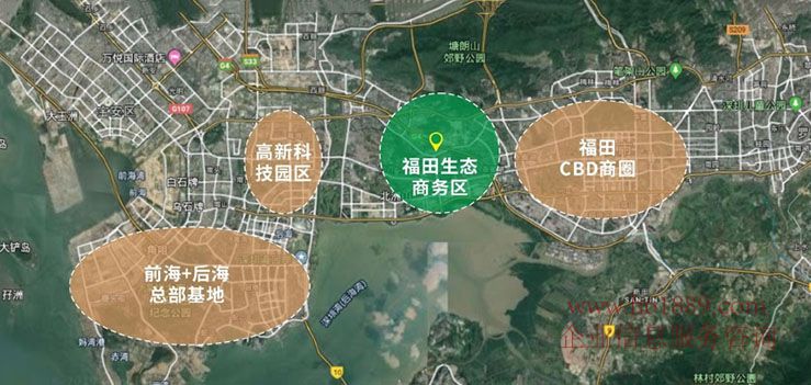 福田生態(tài)商務(wù)區(qū)地理位置極其優(yōu)越,周邊圍繞著高新科技園區(qū)、前海+后海總部基地、福田CBD商圈、大沙河創(chuàng)新走廊、深圳灣超級總部基地等核心科創(chuàng)片區(qū)。
