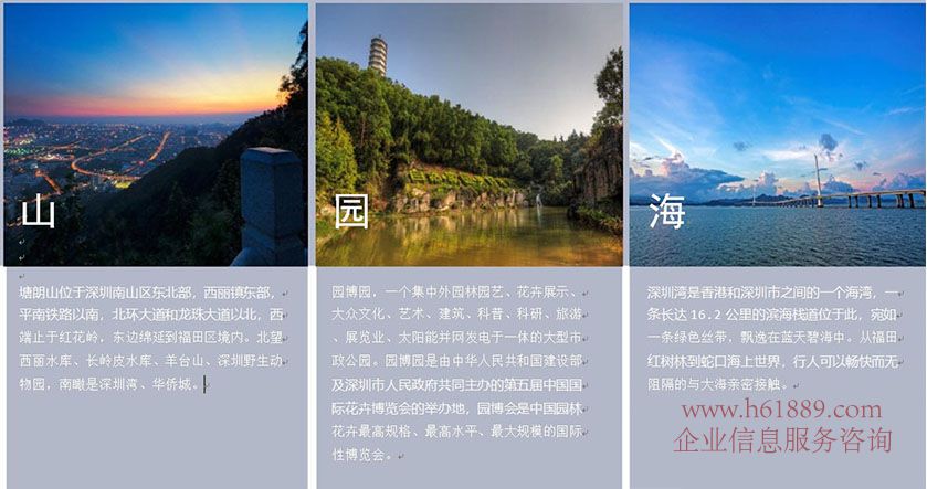 天然資源配套、綠色辦公生活、山(塘朗閃)、園(園博園)、海(深圳灣)