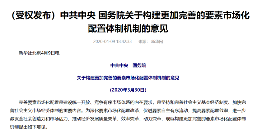 出了一份文件《中共中央、國務(wù)院關(guān)于構(gòu)建更加完善的要素市場化配置體制機(jī)制的意見》。