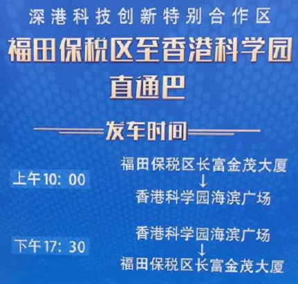 2018年09月27 日、每天上午10:00從福田保稅區(qū)長(zhǎng)富金茂大廈發(fā)班至香港科學(xué)園海濱廣場(chǎng);下午17:30從香港科學(xué)園海濱廣場(chǎng)發(fā)班至福田保稅區(qū)長(zhǎng)富金茂大廈