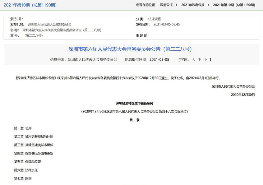 2020年12月30日《深圳經(jīng)濟(jì)特區(qū)城市更新條例》經(jīng)深圳市第六屆人民代表大會(huì)常務(wù)委員會(huì)第四十六次會(huì)議表決通過(guò)。