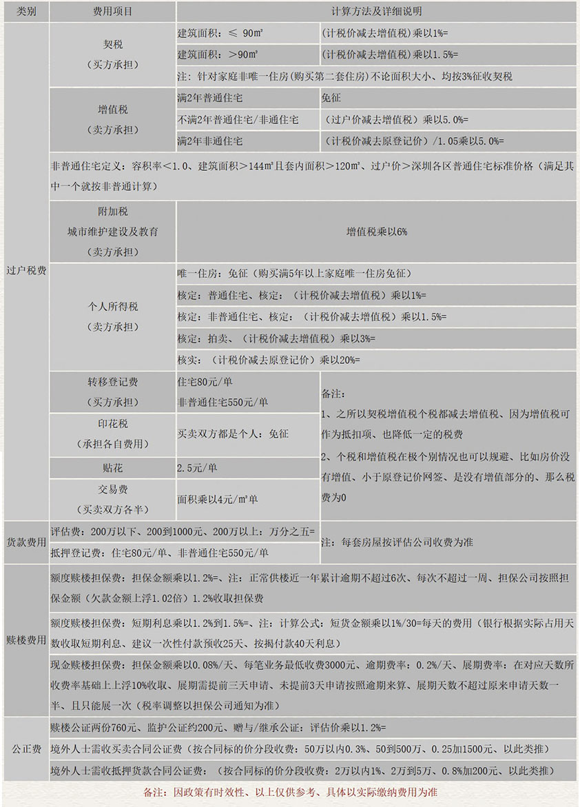 轉(zhuǎn)移登記費(fèi) (買方承擔(dān)) | 住宅80元/單 非普通住宅550元/單 | 備注: 1、之所以契稅增值稅個(gè)稅都減去增值稅、因?yàn)樵鲋刀惪勺鳛榈挚垌?xiàng)、也降低一定的稅費(fèi) 2、個(gè)稅和增值稅在極個(gè)別情況也可以規(guī)避、比如房?jī)r(jià)沒(méi)有增值、小于原登記價(jià)網(wǎng)簽、是沒(méi)有增值部分的、那么稅費(fèi)為0 | ||