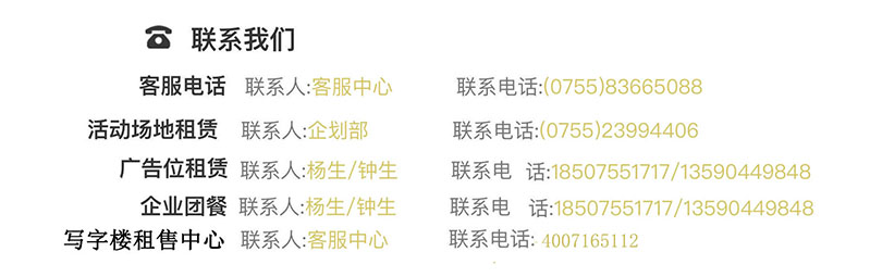 活動場地租賃 | 聯(lián)系人 | 企劃部 | 聯(lián)系電話 | 0755-23994406 | |