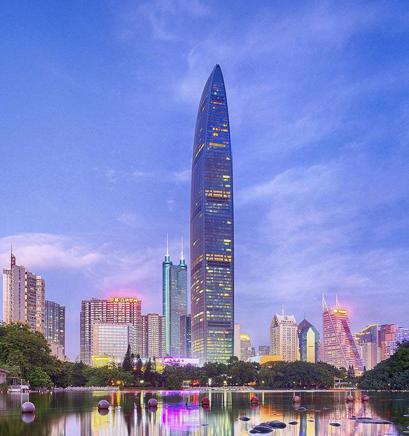 位于項目南面的是京基100大廈,總建面 22 萬平方米,其中包括 17.5 萬平米國際級甲級寫字樓、 4.6 萬平米的鉑金五星級酒店;整棟樓共 100 層,高度為 441.8 米 ,外觀簡潔、流暢,彷如傾瀉于城市之中的瀑布,建成后將成為深圳目前最高的一座地標性建筑,全國第三、全球第 8 高的摩天地標。在外觀幕墻的設(shè)計上,大樓采用的是,目前世界上最先進的單元式玻璃幕墻與環(huán)保高性能超白雙銀 LOW — E 中空玻璃,具有隔音、隔熱、節(jié)能、防輻射、光透度好等優(yōu)點。