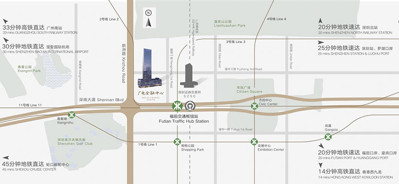 廣電金融中心:地處深南大道與新洲路交匯處、無縫銜接福田站綜合交通樞紐、享有得天獨(dú)厚的交通優(yōu)勢(shì)