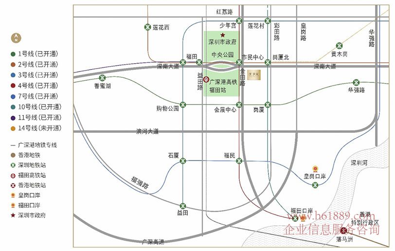 福田高鐵城際樞紐、超級(jí)雙口岸(皇崗口岸、福田口岸)城市樞紐-地鐵1、2、3、4、10、1114號(hào)線交匯立體交通