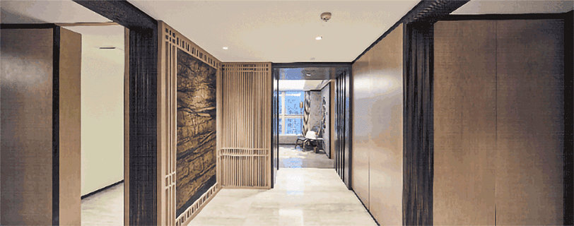深圳中心天元、崗廈天元花園、打開玄關(guān)另一道隱形門,即見書房空間和一間套房。以玄關(guān)與書房為圓心,以藝術(shù)長廊為軸線,將北向的動區(qū)即客廳+廚房以及南向的靜區(qū)即三間臥室實現(xiàn)有效的動靜、干濕分區(qū)