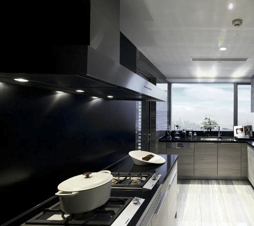繞過餐桌,即見獨(dú)立U形廚房,充分參考人體工程學(xué),配備世界TOP廚電品牌。昂貴的Gaggenau嘉格納八件套(抽煙機(jī)、3燃?xì)忸^的燃?xì)庠?、冰箱、帶消毒功能洗碗柜、蒸烤爐一體機(jī)、酒柜、咖啡機(jī))、國際櫥柜品牌及人性化配置(廚房空調(diào)),帶來奢華的享受