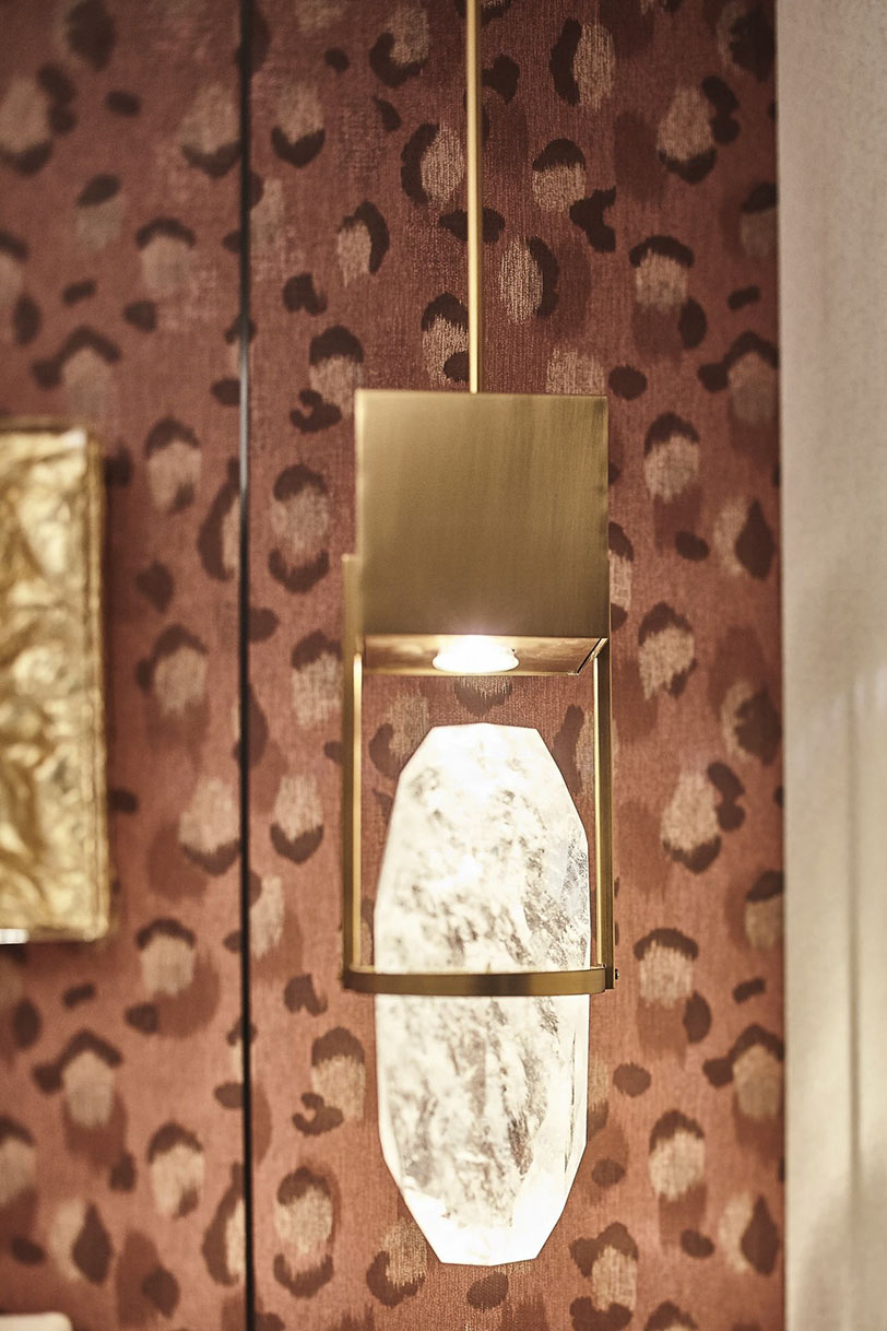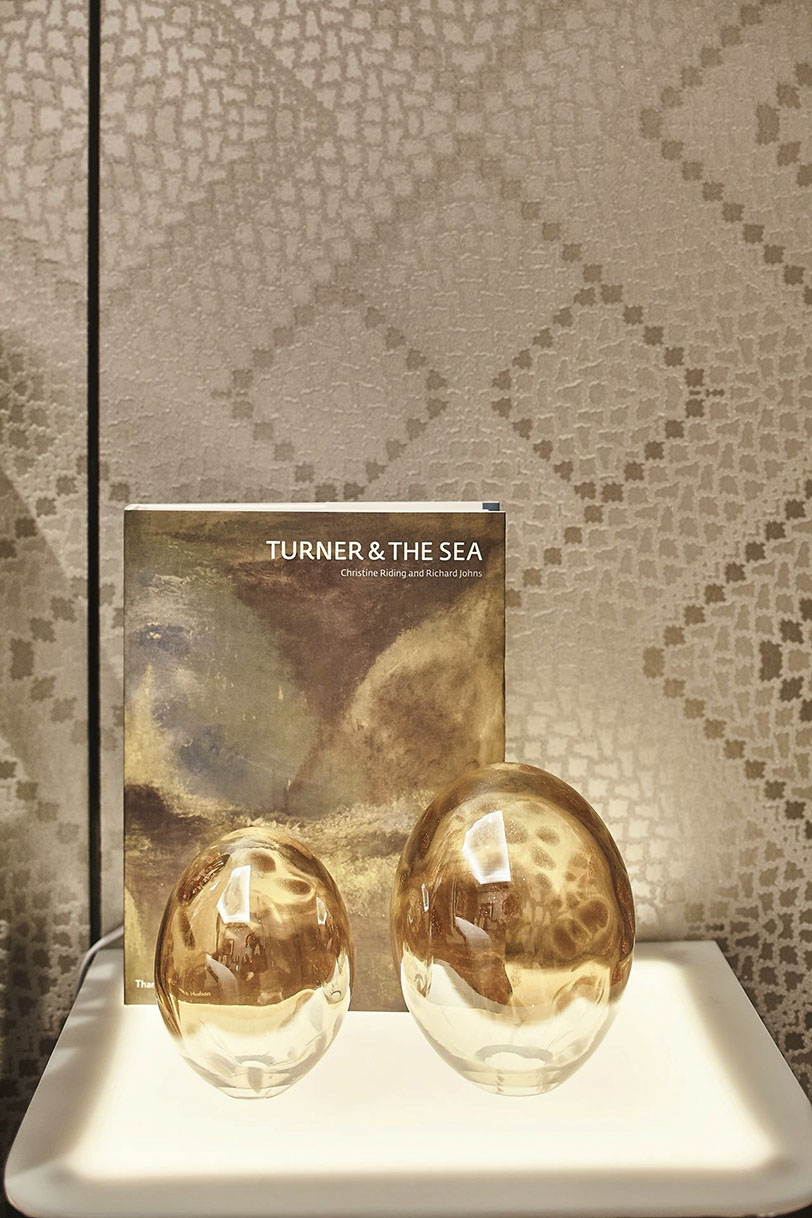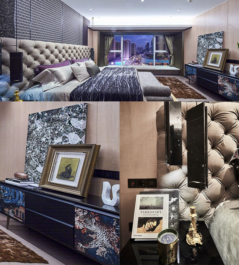 另一間具有名媛風(fēng)的奢闊臥室,與窗外中央大街的波點燈光藝術(shù)呼應(yīng)。窗前的T7星空園林“月牙泉”美景躍然入室,令人醉心