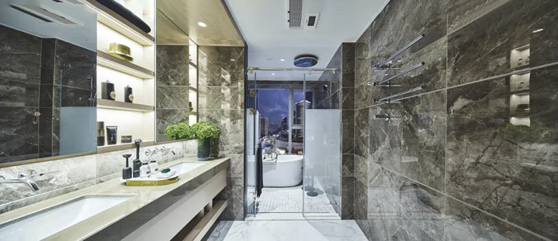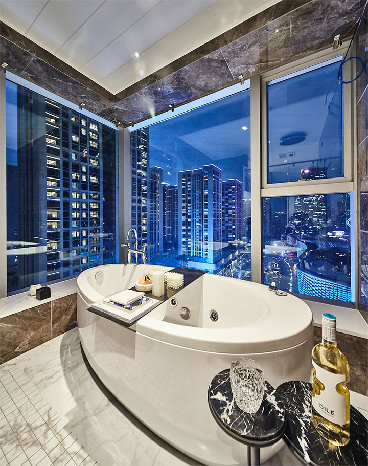 深圳中心天元、崗廈天元花園、270度轉(zhuǎn)角浴缸,室外是伸手可觸摸的大都會繁華與精彩,室內(nèi)是可觸摸的國際高貴與時尚氣息。盥洗間浴缸、馬桶、水龍頭、花灑等皆使用國際奢侈大品牌,其中主臥浴缸為世界第一個軟體浴缸締造品牌卡力仕,使用了宇宙飛船及火箭上的耐熱保護(hù)層技術(shù),“遇熱水即軟如沙發(fā)”,與瑞吉酒店總統(tǒng)套房同款