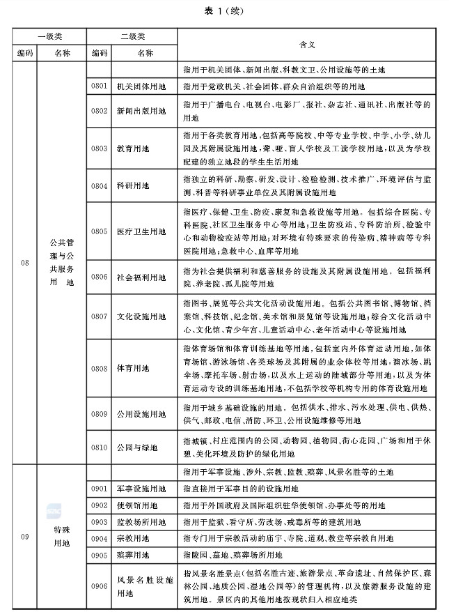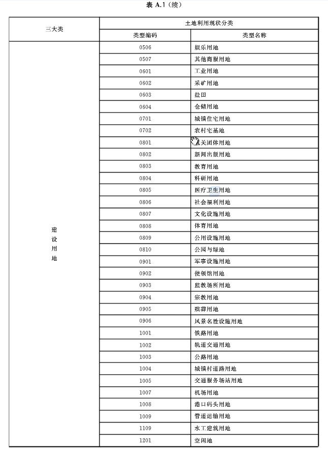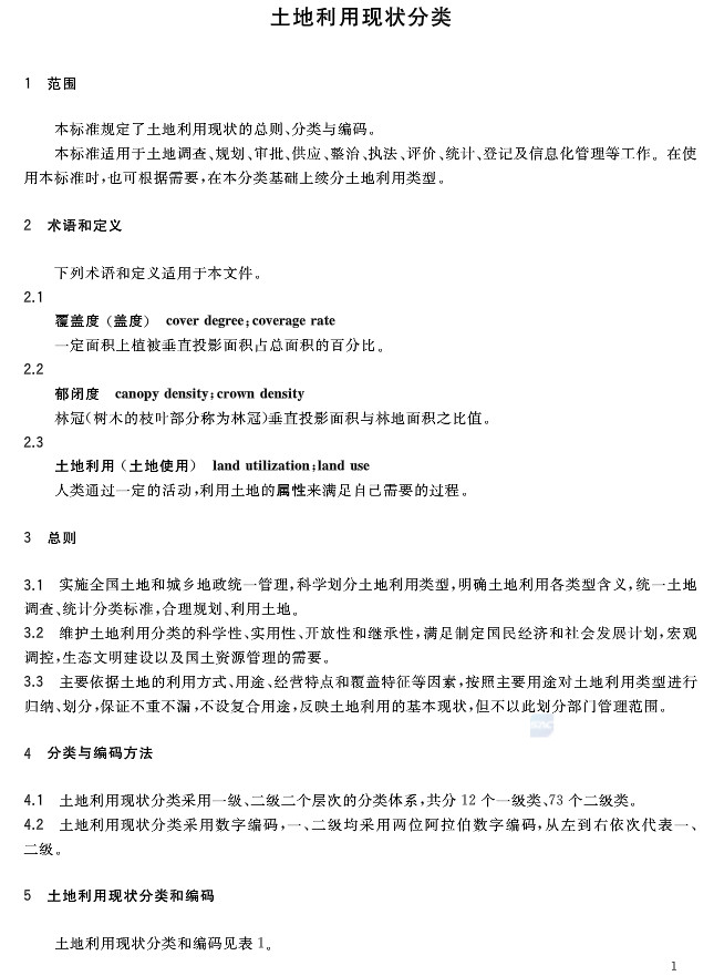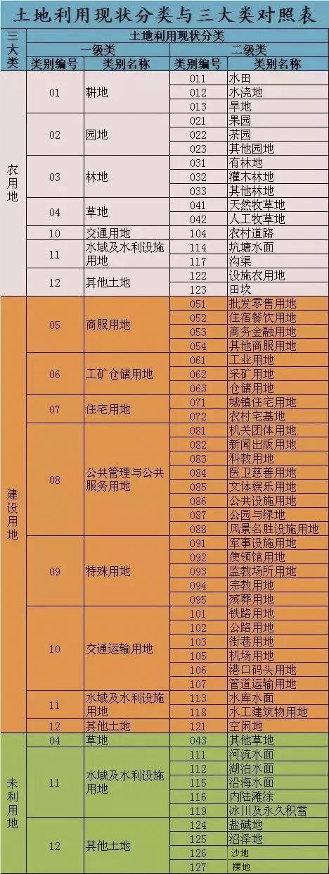《土地利用現(xiàn)狀分類》國家標準采用一級、二級兩個層次的分類體系,共分12個一級類、57個二級類。其中一級類包括:耕地、園地、林地、草地、商服用地、工礦倉儲用地、住宅用地、公共管理與公共服務用地、特殊用地、交通運輸用地、水域及水利設施用地、其他土地。