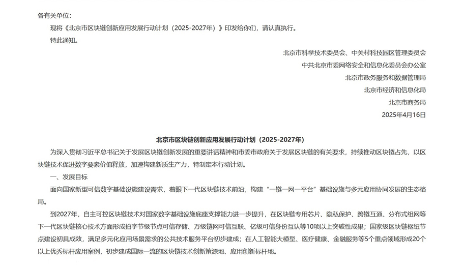 在全球數(shù)字化浪潮洶涌、Web3概念方興未艾之際,中國政府再次展現(xiàn)了其在區(qū)塊鏈技術(shù)領(lǐng)域的雄心與布局。近日,北京市多個核心政府部門聯(lián)合發(fā)布了一項名為《北京市區(qū)塊鏈創(chuàng)新應(yīng)用發(fā)展行動計劃(2025–2027年)》的重要政策文件,清晰地勾勒出未來三年首都乃至全國在區(qū)塊鏈技術(shù)研發(fā)、基礎(chǔ)設(shè)施建設(shè)和產(chǎn)業(yè)融合應(yīng)用的宏偉藍圖。這份計劃不僅將區(qū)塊鏈定位為“產(chǎn)業(yè)數(shù)字化的核心技術(shù)”,更在嚴格的加密貨幣禁令背景下,釋放出可能探索“數(shù)字資產(chǎn)”應(yīng)用的微妙信號,引發(fā)市場高度關(guān)注
