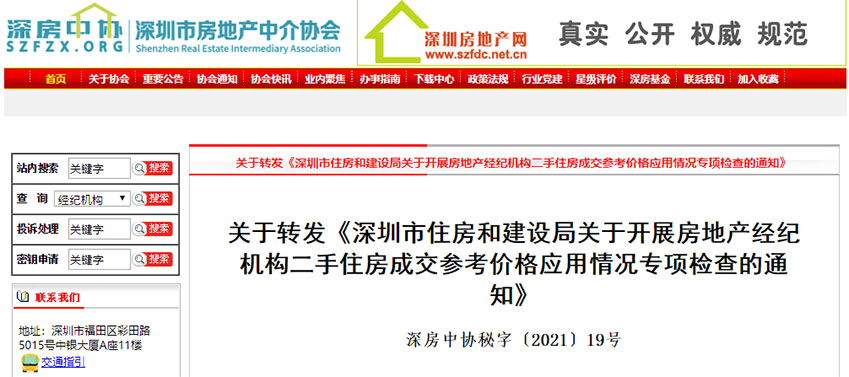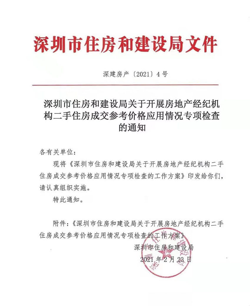 2021年2月23日,深圳住建局發(fā)布《深圳市住房和建設局關于開展房地產經紀機構二手住房成交參考價格應用情況專項檢查的工作方案》。