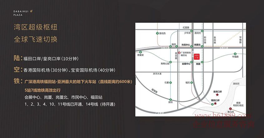 灣區(qū)超級(jí)樞紐:全球飛速切換、陸:福田口岸/皇崗口岸(10分鐘)、空:香港國際機(jī)場(chǎng)(30分鐘)、寶安國際機(jī)場(chǎng)(40分鐘)、鐵:廣深港高鐵福田站-亞洲最大的地下火車站(直線距離約600米)、5站7線地鐵高效出行、會(huì)展中心、崗廈、崗廈北、市民中心、福田站:1、2、8、3、4、10、11、14、號(hào)線已經(jīng)開通