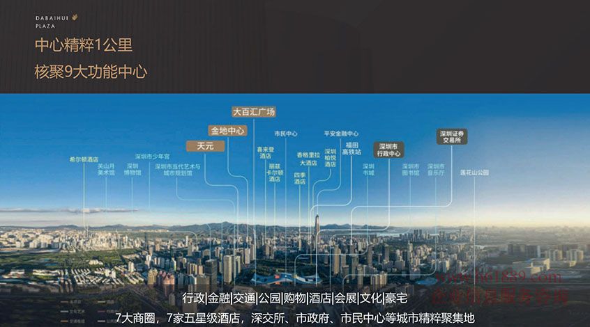 私募證券大廈【大百匯廣場(chǎng)】中心精粹1公里、核聚9大功能中心(行政、金融、交通、公園、購物、酒店、會(huì)展、文化、豪宅)7大商圈、7家五星級(jí)酒店、深交所、市民中心等城市精粹聚集地