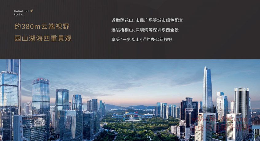 私募證券大廈【大百匯廣場(chǎng)】約380米云端視野、園山湖海四重景觀、近瞰蓮花山、市民廣場(chǎng)等城市綠色配套、遠(yuǎn)眺梧桐山、深圳灣等深圳東全景、享受、一覽眾山小、的辦公新視野