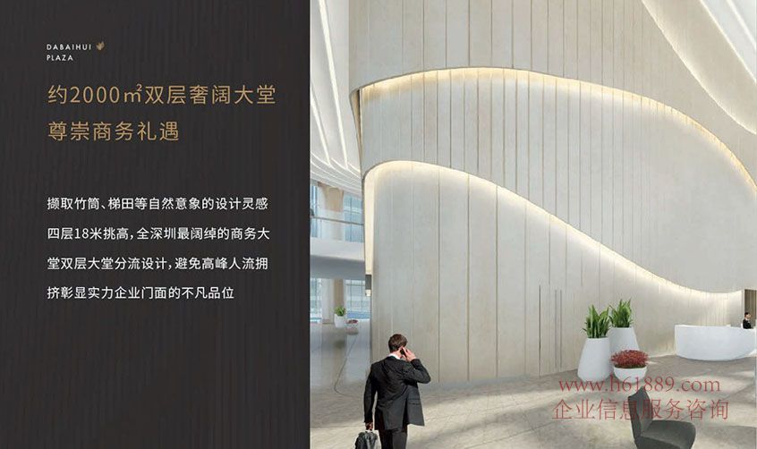 私募證券大廈【大百匯廣場(chǎng)】約2000米雙層奢闊大堂、尊崇商務(wù)禮遇、擷取竹筒、梯田等自然意向的設(shè)計(jì)靈感、四層18米挑高、全深圳最闊綽的商務(wù)大堂、雙層大堂分流設(shè)計(jì)、避免高峰人流擁擠彰顯實(shí)力企業(yè)門面的不凡品位