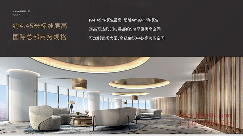 約4.45米標(biāo)準(zhǔn)層高、國際總部商務(wù)規(guī)格、約4.45米標(biāo)準(zhǔn)層高、超越4米的市場(chǎng)標(biāo)準(zhǔn)、凈高可達(dá)約3米、局部約9米罕見挑高空間、可定制奢闊大堂、高級(jí)會(huì)議中心等功能空間